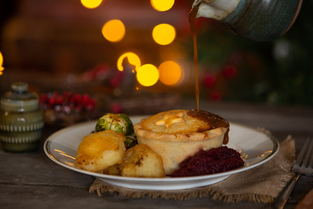 - Main: Christmas Pie with roast potatoes, seasonal vegetables, pigs in blankets, and rich gravy