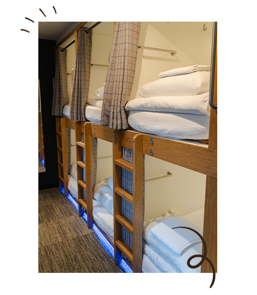 If you’d like to guarantee that your group stays together, the best option is to book a private dormitory. If you’ve booked individual capsule beds, we’ll always do our best to place you all in the same room, but we can’t guarantee it.